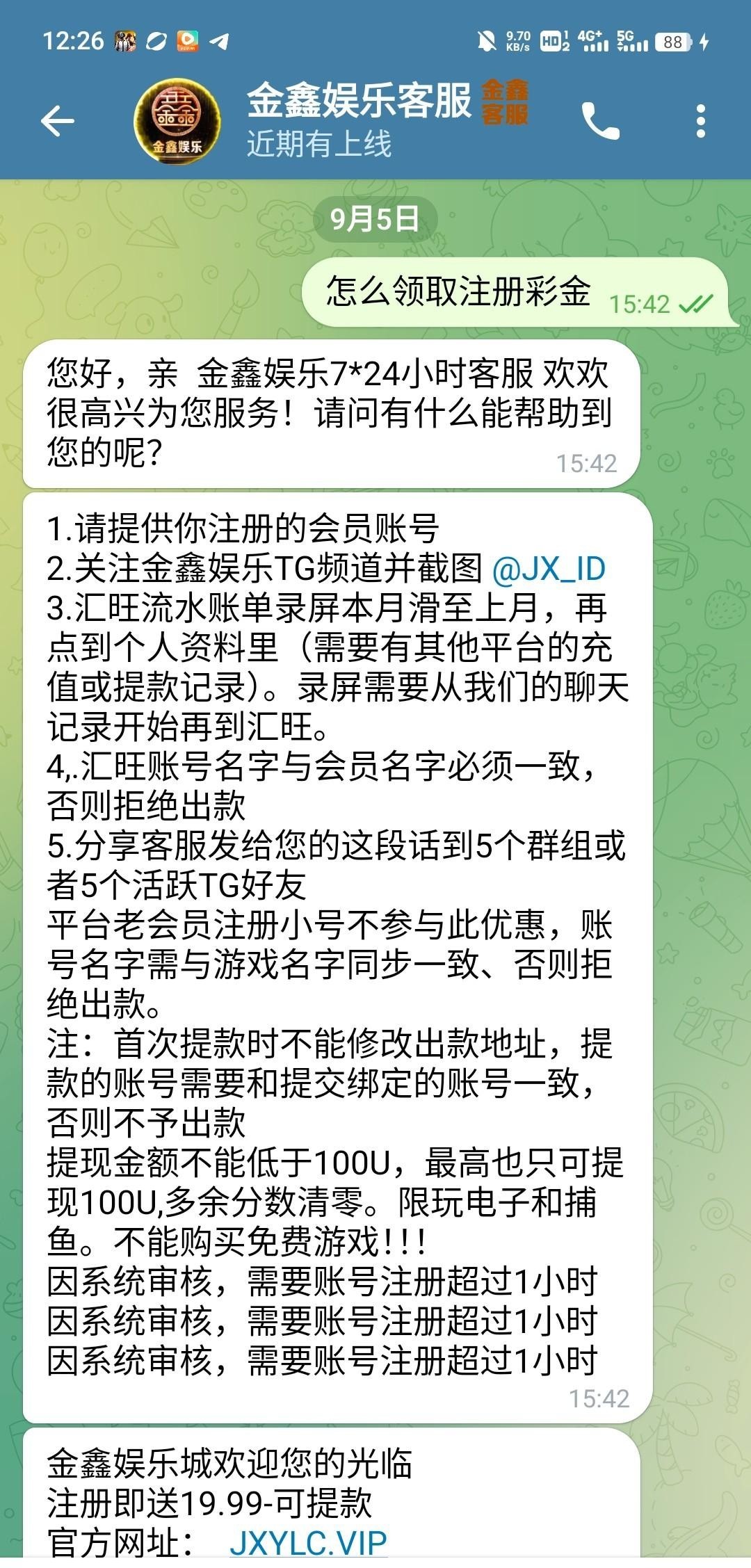 金鑫娱乐城联系飞机客服@JXYLCKF,按照客服要求注册,我欧意流水也给了,最高最低100u,我没打出来