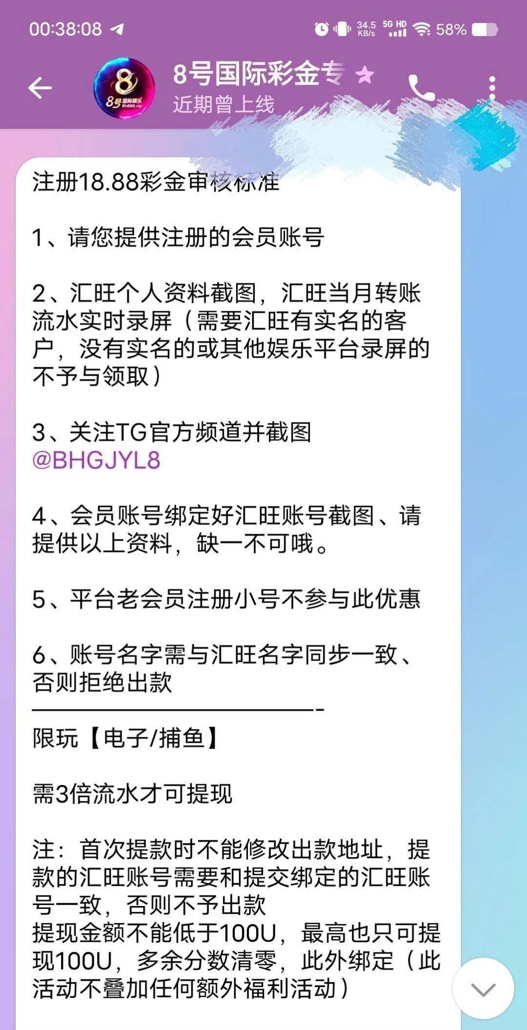 新人注册送18.8U,注册账号绑定出款账号 联系飞机客服@BHGJYLCJ01领取,要录制流水视频。限制电子捕鱼3水,最低最高提100u,我给欧易流水也给了