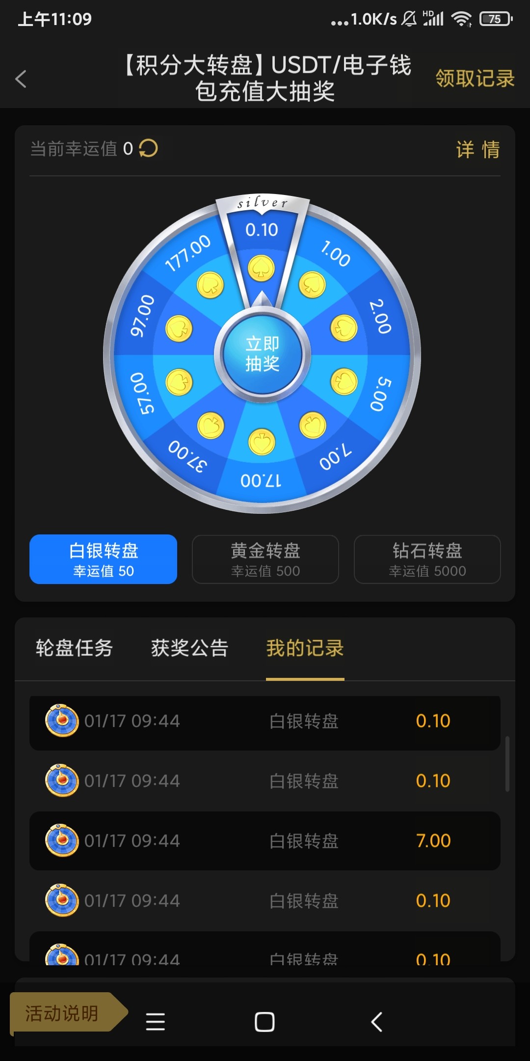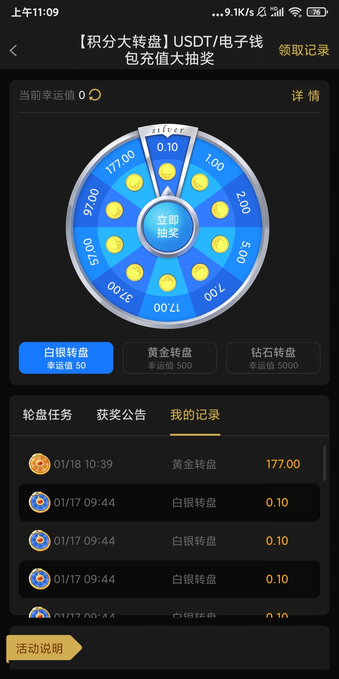 722充值送转盘积分,这个我喜欢,隔三差五我能出个177.