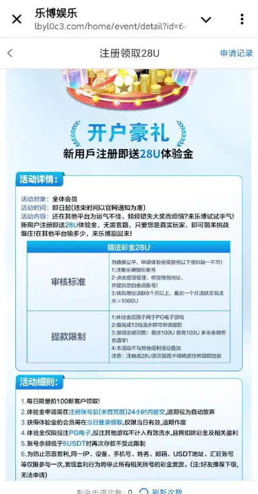 每天一百名额尽量在00点到06点这个阶段申请,乐博娱乐送28u 地址活跃六个月以上本月流水过1000u